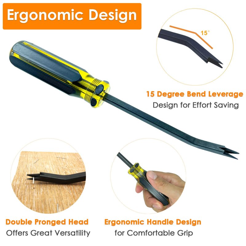 - Easy to Use: This upholstery tool has a leverage design with 15 degree bend and it is just the right amount for you to pull out any staples, tacks or nails quickly and easily, protect your hands from stress or pain, save your time and effort