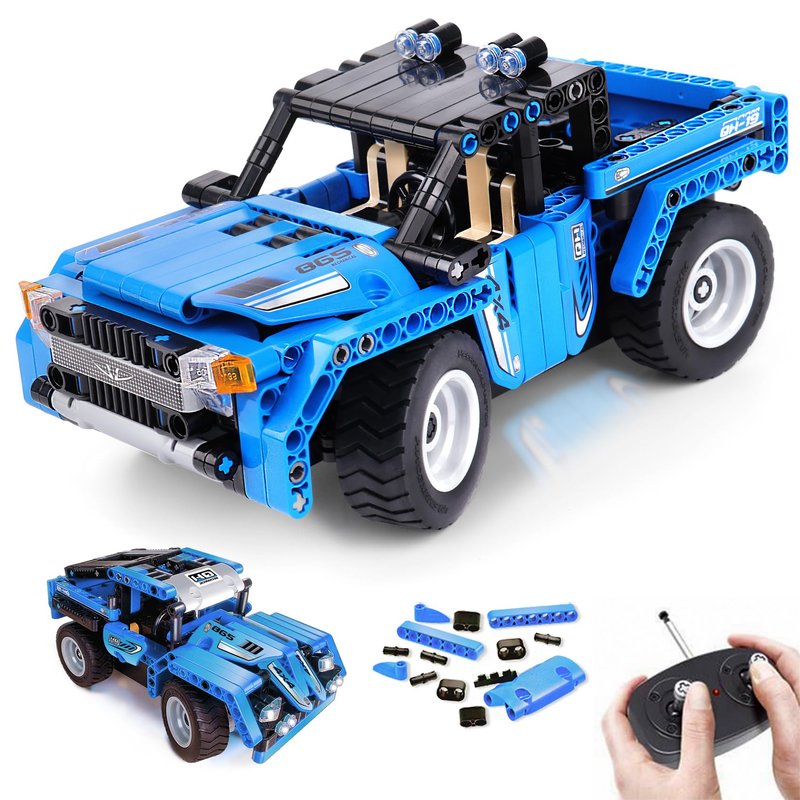 - Flexible RC Building Kits: Children can build a transport pickup truck or an off-road racing truck. They can control it indoors or race it outdoors. The cool truck can race across most flat surfaces easily, even on sand, grass, gravel, or soil. Kids can play it by themselves or with friends and family.