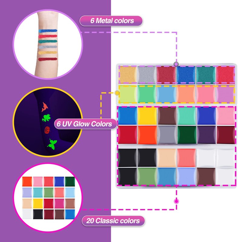 - Professional Face Painting Kit Included:The Halloween paint makeup package is suitable for kids and adult.it include 32 Face Paints with 20 classic,6 metal and 6 UV glow colors,10 Paint Brushes,38 stick stencils,2 sponges and 2 glitters.You can follow the instructions to use it.