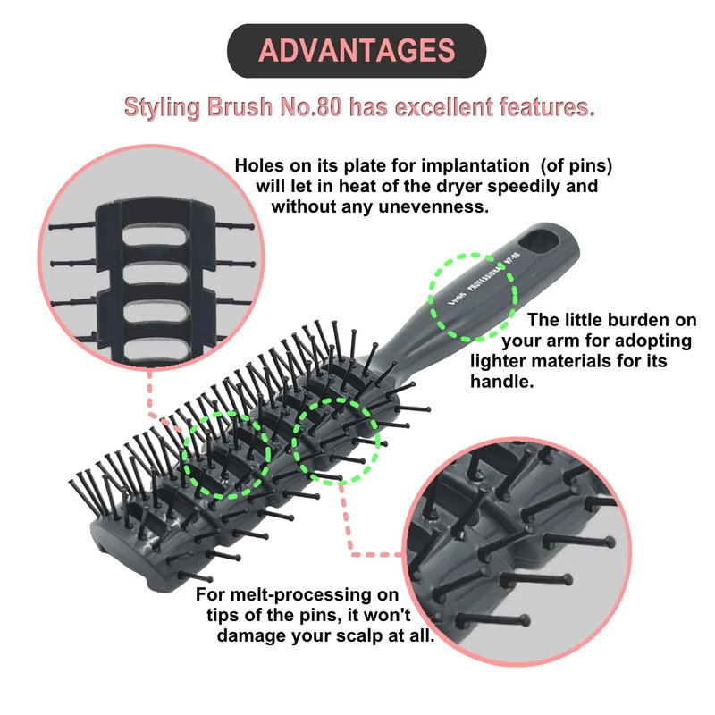 It is a 9-row styling brush with little burden on your arm for adopting lighter materials for its handle. You can choose from three different colors: blue, red, or gray. The choice is yours to pick whichever color you like the most. Buying all three colors is a great choice as well for your whole family to use.