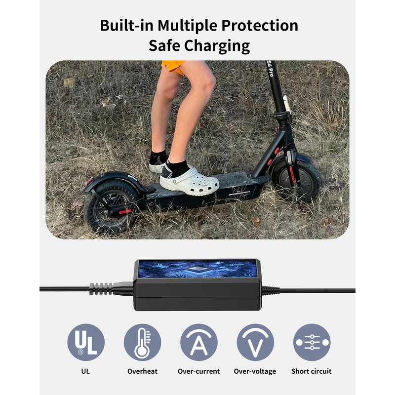 - Safety Features: for iScooter Charger CE, FCC, RoHS, and ETL certification standards, featuring built-in overcurrent, overvoltage, short circuit, and over-temperature protection for safe and secure charging