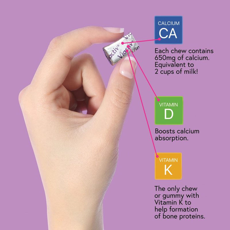 - Calcium and Vitamin D Supplement Chews: Two Viactiv chews a day provides 100 percent of your daily recommended Calcium plus Vitamin D and Vitamin K, with less sugar vs. leading gummy