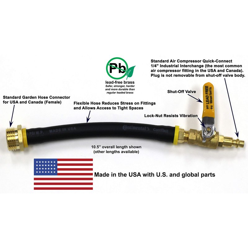 A quick and easy way to blow out the water lines of your RV, motorhome, camper, boat, and travel trailer. Winterizing is easy with this blow out adapter. One end of the adapter has a male garden hose faucet/spigot/spout connection which screws directly to the city water inlet on your RV, motorhome, boat or travel trailer. The other end of the adapter has a quick-connect plug designed to connect to most air compressors. If your compressor does not have quick-connect coupler, you can easily remove the quick-connect plug with a wrench to get access to the 1/4" male NPT (national pipe thread) connection, which is a very common connection. Your local hardware store should be able to help you find the proper adapter to connect the 1/4" male NPT to your air compressor. The flexible hose allows the adapter to access tight spaces and minimizes stress on your piping and fittings. We use food-grade vegetable oil and non-toxic plumber's pipe dope only in the installation process. Most commercially available brass fittings contain up to 8% lead, but for your health and safety, the lead-free brass fittings in this item have been tested by an independent testing lab and certified to contain less than 0.25% lead.