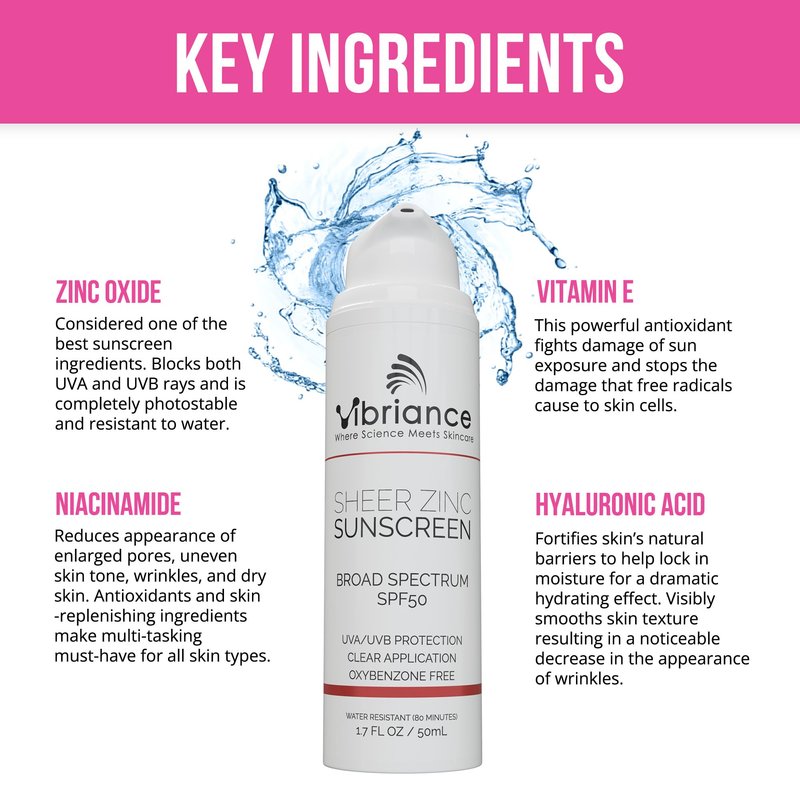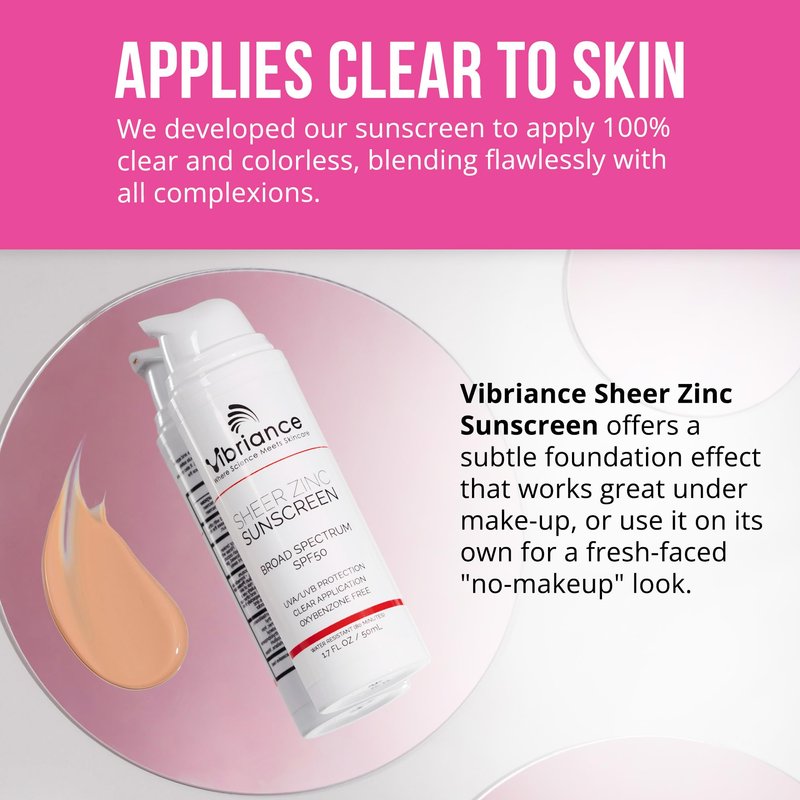 - PROTECT & HYDRATE: Vibriance Sheer Zinc Facial Sunscreen is the perfect blend of hydration and sun protection. Our tinted SPF 50 sunblock defends against harmful UV rays for broad spectrum sun protection while keeping skin moisturized and youthful.