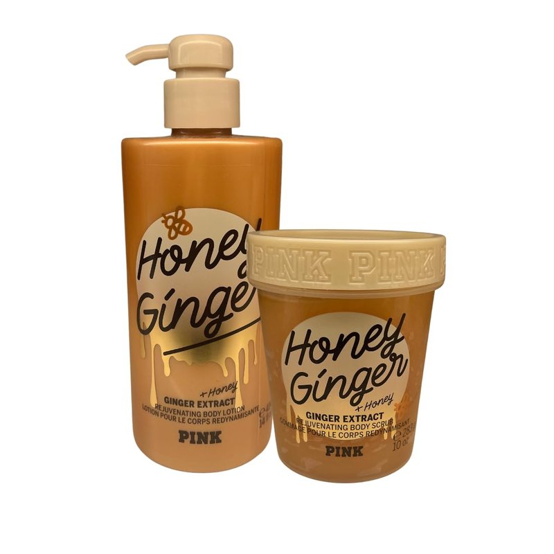 Experience the ultimate moisturization with this 2-piece Victoria’s Secret Pink Honey Ginger. This set includes the Pink Honey Ginger Body Lotion and Body Scrub, perfect for indulging in a pampering skincare routine. Get your skin glowing with the Pink Honey Ginger Body Scrub, infused with pure honey, ginger extract, and radiance-boosting sugar crystals. Smooth on the Pink Honey Ginger Body Lotion for golden hydration with a delightful spiced twist.