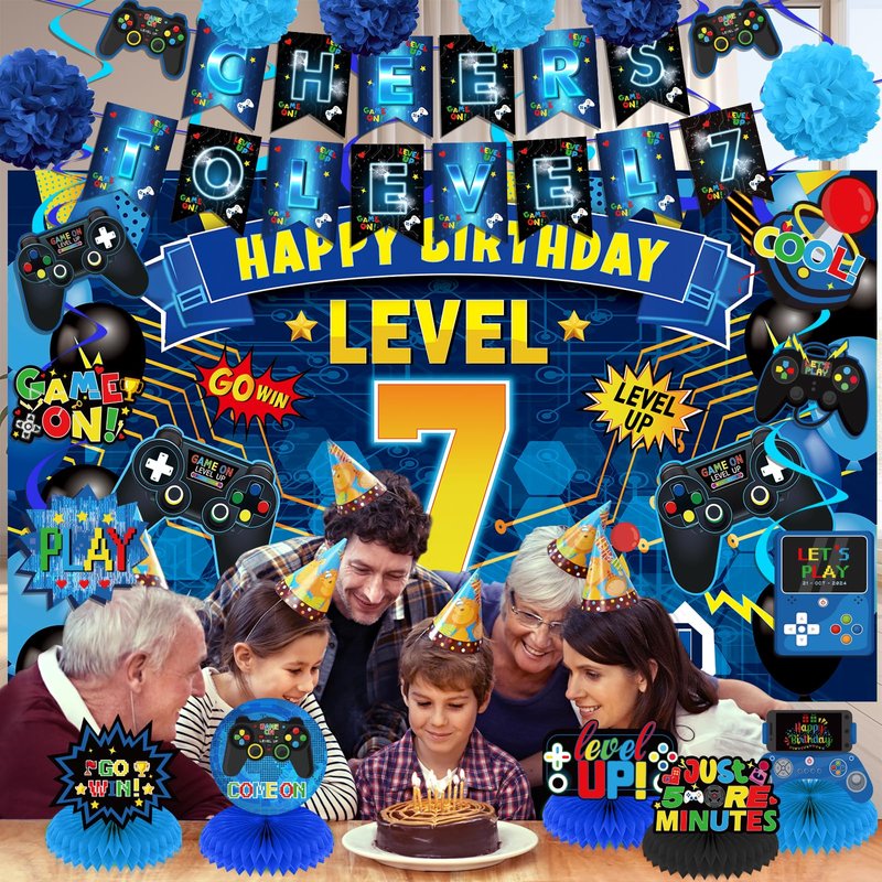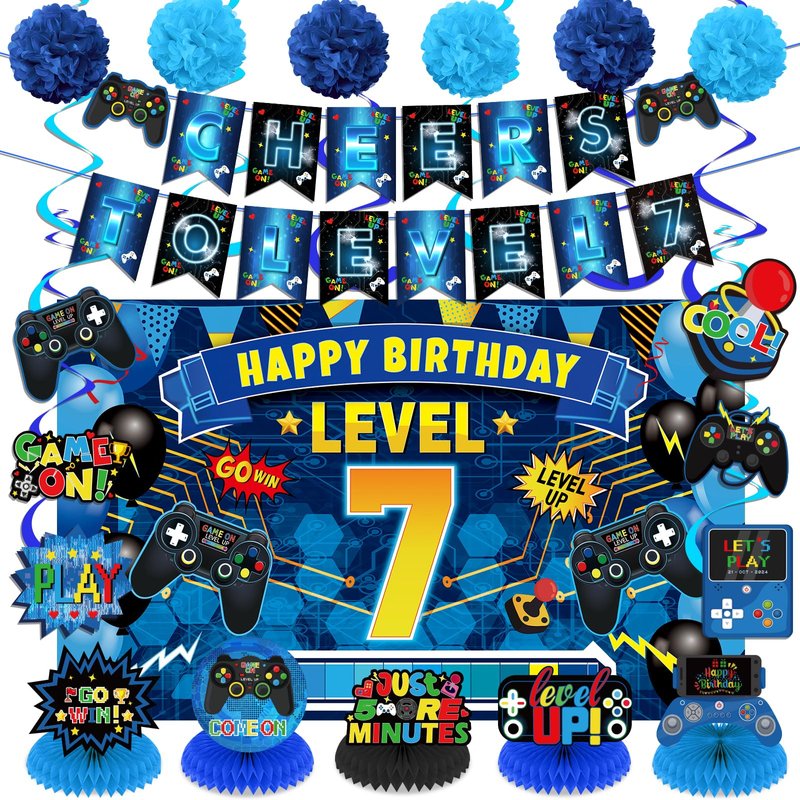 - 【Package Included】: The happy birthday Level 7 decorations set includes 1pc CHEERS TO LEVEL 7 Pre-Strung Banner, 1pc Happy Birthday LEVEL 7 banner backdrop, 6pcs tissue paper pompoms, 6pcs hanging swirls and 5pcs honeycomb centerpieces in different video game theme patterns
