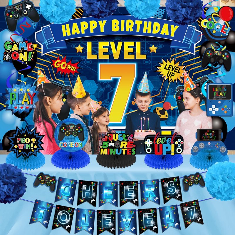 - 【Reliable Material】: The video game level 7 Pre-Strung banner, tissue paper pompoms, honeycomb centerpieces and video game controller hanging swirls are made of quality paper cardboard and quality foil with a smooth surface, the video game element patterns are all double printed. The Happy Birthday LEVEL 7 backdrop banner is made of polyester fabric with bright colors. It is washable and reusable