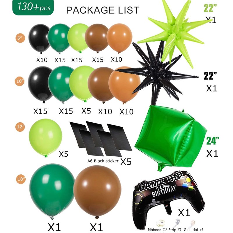 - 【Vibrant Green Black Balloon KIT】Custom 130pcs Unique Video Gamer balloon garland! Different sizes balloons in Green /brown/Black balloon, Theme balloon including 4D mylar Cube/starburst/ controller balloons and with instresting Diy Black Sticker for Making Balloon face! Diy Your Game charater or Pixel Face party Will be remarkable forvideo game theme party!