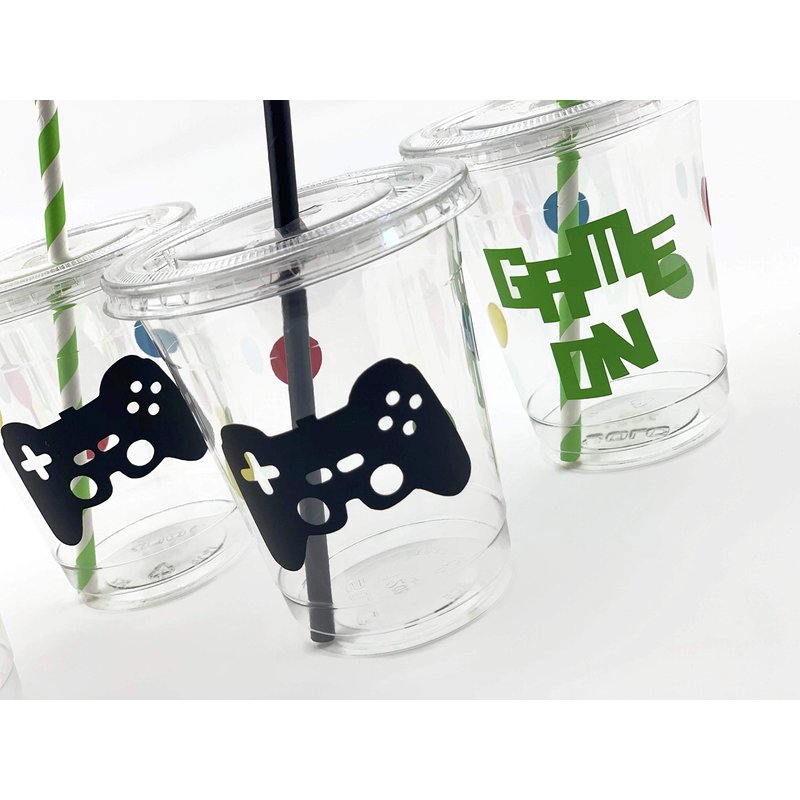 Celebrate your special occasion with these fun video game party cups! Includes a set of 12 Clear Soft Plastic 12oz Disposable Plastic Drinking Cups with Handmade Vinyl Decals, Clear Plastic Straw Slotted Lids, and Paper Straws. Handmade in Oregon, USA.