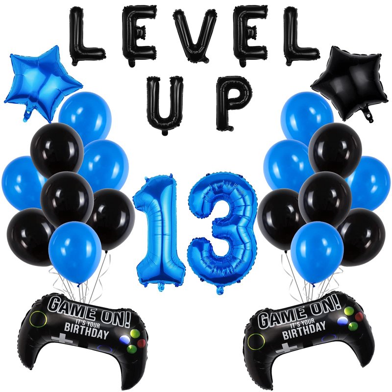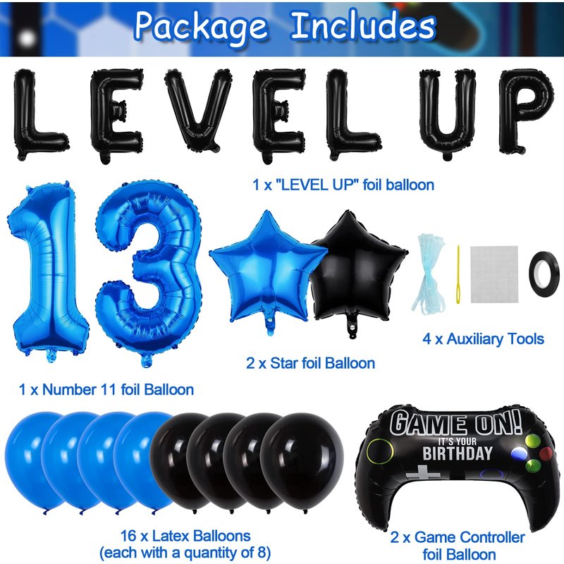- 13TH BIRTHDAY PARTY BALLOON KIT: 2*gamepad aluminum foil balloons, 2*star aluminum foil balloons, 1 set of 16-inch Level Up foil balloon sets. 1*32 inch number 13 balloon, 16*10 inch latex balloon (8 dark blue, 8 black).