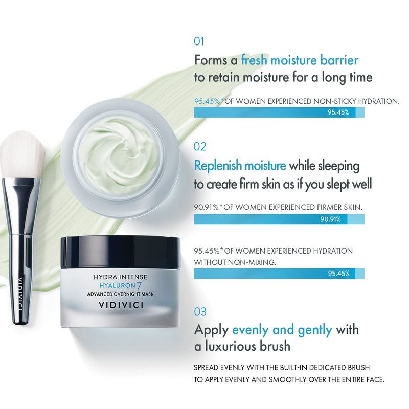 - ENRICHED WITH 7-FOLD HYALURONIC ACID: Vidivici Hydra Intense Hyaluron7 Advanced Overnight Mask offers your skin with never-seen moisture. Our sleep mask contains 7 types of Hyaluronic acid with super marine extracts to make your skin unbelievably soft and moisturized.