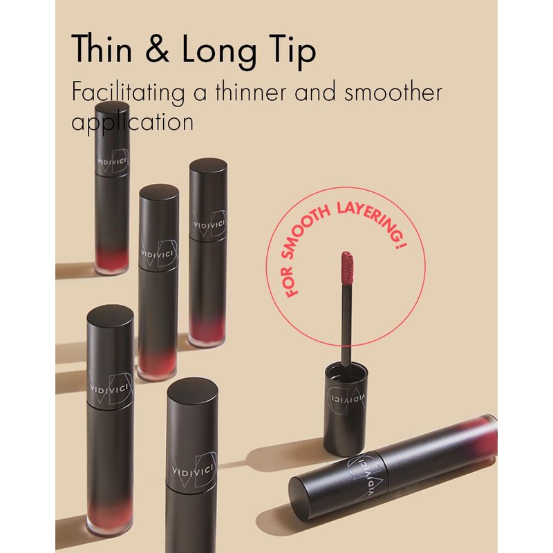 - PRECISION APPLICATOR: Achieve a good pout with the thin and long tip applicator included with your VIDIVICI Millennial Tint Velvet. This innovative design facilitates a thinner and smoother application, allowing for precise control and an even distribution of color. With a good balance of moisture and color, your lips will look and feel soft, smooth, and absolutely stunning