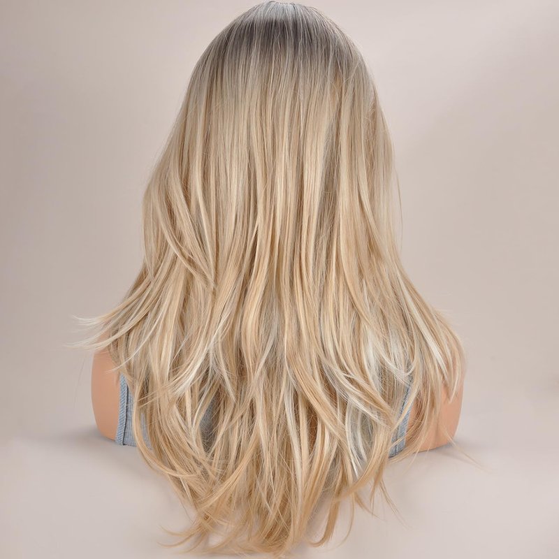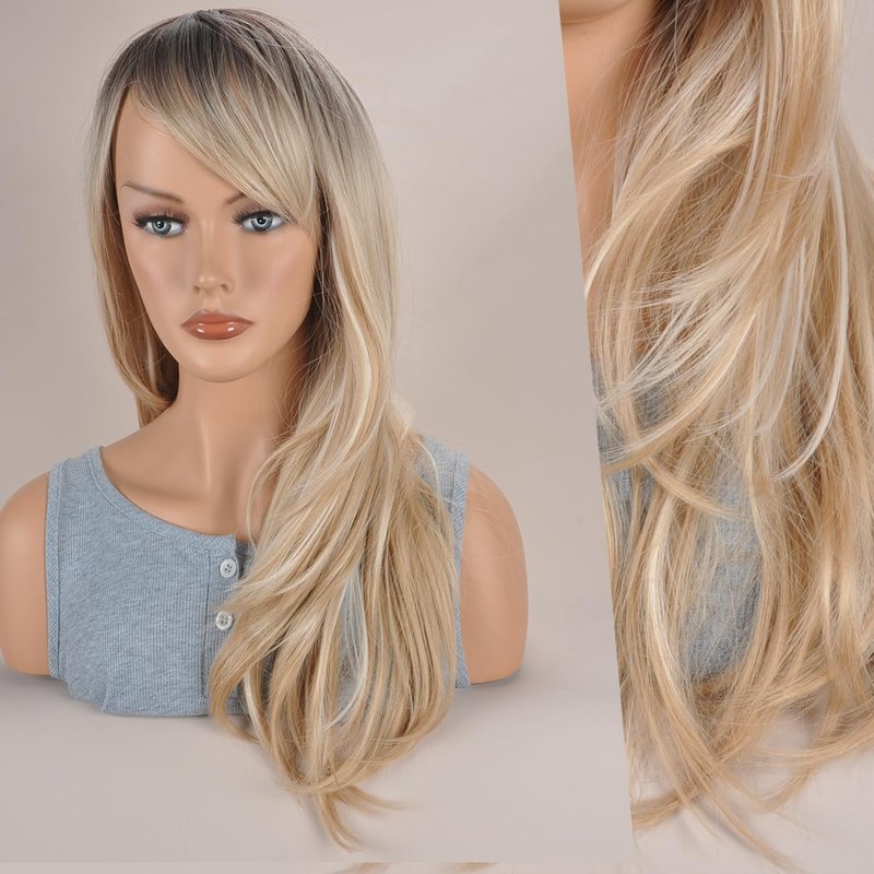 Vieuinaux Blonde with Dark Roots ombre Wigs With Bangs,Long Wavy Straight Blonde Wigs for Women Heat Resistant Synthetic Wigs For Daily (Ombre Blonde Wave)