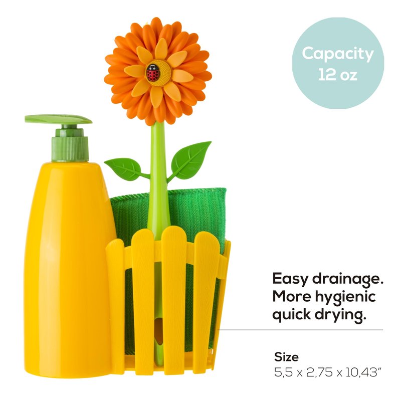 The Flower Power Orange Sink Side Set is a compact, multipurpose dishwashing bundle designed to keep countertops organized and clutter-free. Characterized by a fanciful floral theme, this playful product enjoys a pleasing color palette, from its sunny yellow caddy and matching soap dispenser to its daisy-shaped dish brush and grass green sponge. Behind the bright orange blossom sprouts a clutch of hardwearing nylon bristles that strip grease and grime without scratching sensitive surfaces; an extra-long, ergonomic handle offers optimal comfort. The picket fence storage tray keeps sponges, scrubbers, and scrapers all in one convenient spot, while discreet drainage holes let lingering water droplets flow back into the sink.