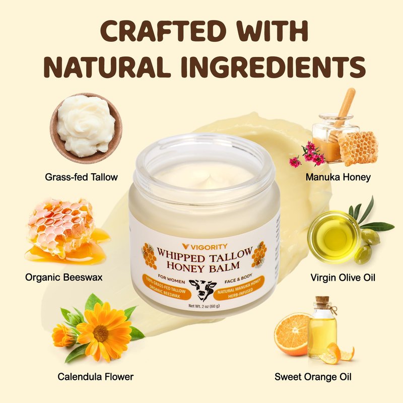 Vigority Beef Tallow and Honey Balm for Women: Organic Grass Fed Whipped Beef Tallow for Skin - Beef Tallow Face Moisturizer Infused with Manuka Honey, Beeswax and Olive Oil - 2 oz, Unscented