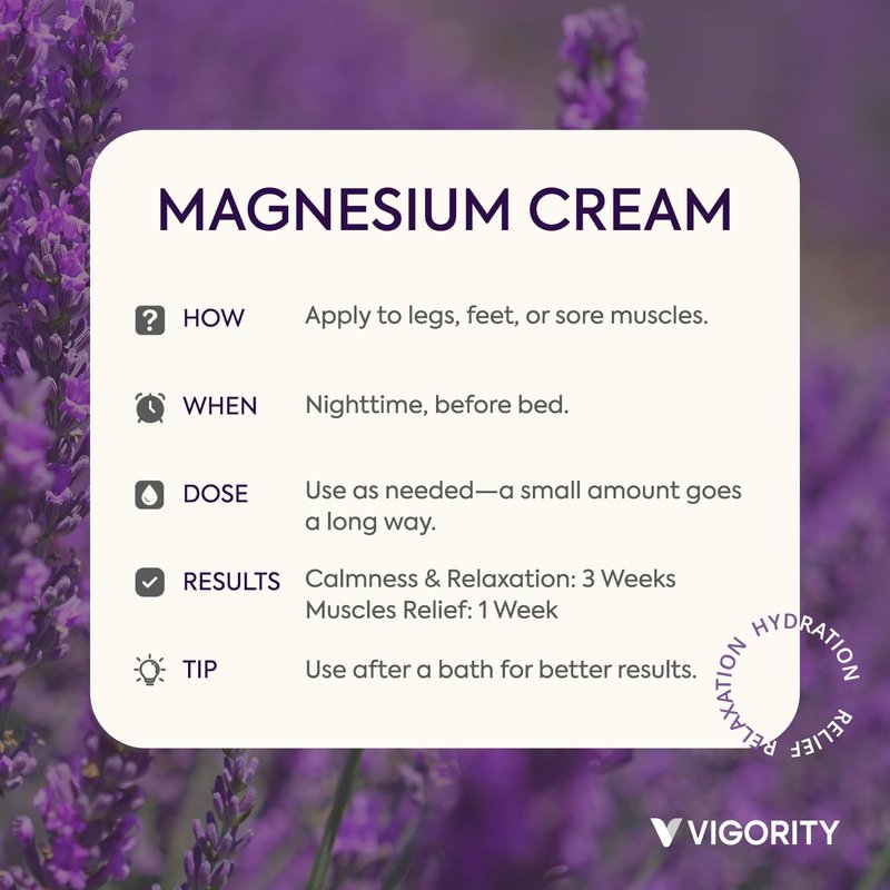 - How to Use and When to Expect Results: For best results, apply Vigority Magnesium Cream before bed or after a relaxing bath. Massage it into your legs, feet, or any areas that feel tight. Wear socks for enhanced absorption and results. Muscle relief is usually felt within a week, and improved sleep comes after about three weeks (21 days).