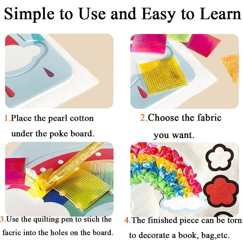- 【Creative Puzzle Puncture Painting】A unique and fun way to play crafts, children can poke pieces of fabric into the holes to create different color combinations for dress up. Place the pearl cotton underneath the poke boards and start creating. The poke board has a self-adhesive backing, so you can tear it off and stick it anywhere when you're done creating.