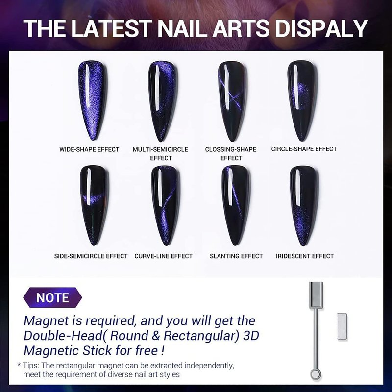 - AURORA & Cat Eye EFFECTS:With this Magnetic Gel Polish you will get different fantastic Cat Eye Effects, like the galactic hole effect, slash effect, starry sky effect, etc. Attractive color changing and cat eye effects will surprise you. Different light and angles will show different cat eye effects