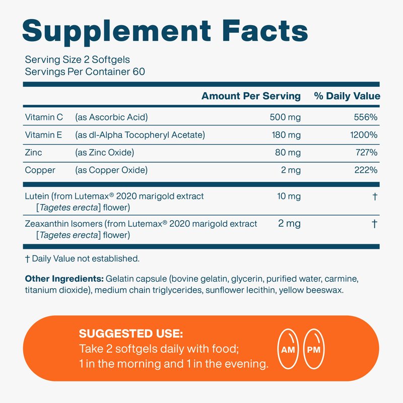 - CONVENIENT DAILY DOSE: Each bottle of Vision Protection contains a 60-day supply of 120 easy-to-swallow capsules. With a recommended daily dosage of two AREDS2 capsules per day with food, 1 in the morning and 1 in the evening, this supplement offers a convenient way to incorporate the necessary nutrients for eye health into your daily routine.