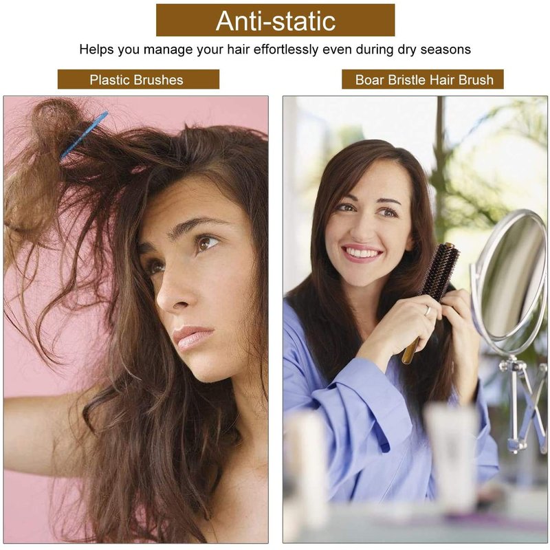 - Effortless use & Easy to clean - The ergonomic wooden handle makes you feel comfortable. The round brushes design allows the brush to effortlessly flow through your hair without feeling stiff. It is necessary to clean the round boar bristle hairbrush regularly to ensure your hair stay healthy. Use the hair brush cleaning tool make it easy and fast to keep it clean.