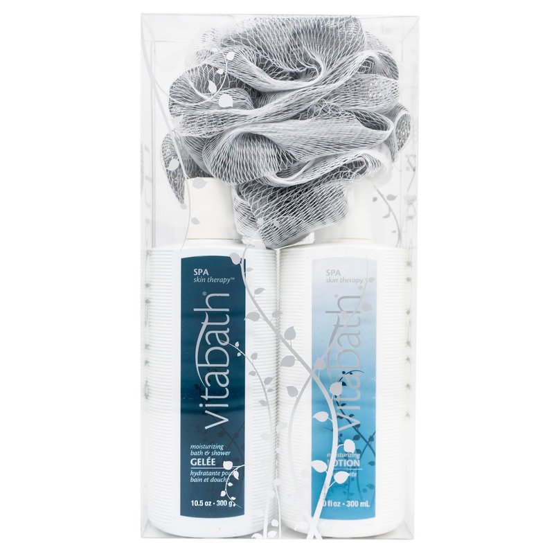 Vitabath Spa Skin Therapy Everyday Skincare Set Moisturizing Shower Gel Wash, Reviving Lotion & Exfoliating Body Scrubber Pouf - Refreshing Foam Cleanser & Dry Skin Hydration for Women & Men