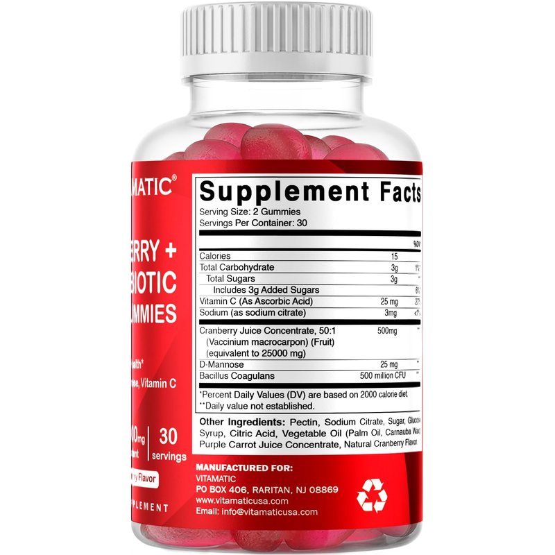 - DELICIOUS NATURAL CRANBERRY TASTE of Vitamatic Cranberry Gummies - Avoid consuming Large Cranberry Capsules, Tablets or Pills which gives unpleasant after taste & can not go down easily