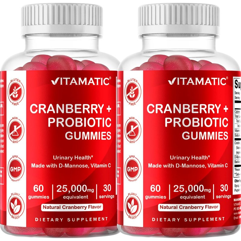 2 Pack - Vitamatic Vegan Cranberry Gummies, 25000 per serving - Made with Probiotics, D-Mannose & Vitamin C - 60 Count - Supports Healthy Urinary Tract Function - (Non-GMO, Gluten Free)