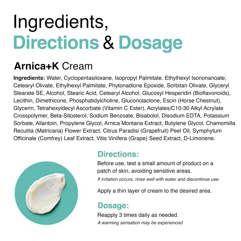 - Arnica Cream with Vitamin K: Featuring arnica montana, vitamin K1 oxide, vitamin C, and horse chestnut to help moisturize and restore skin faster.