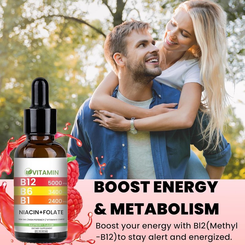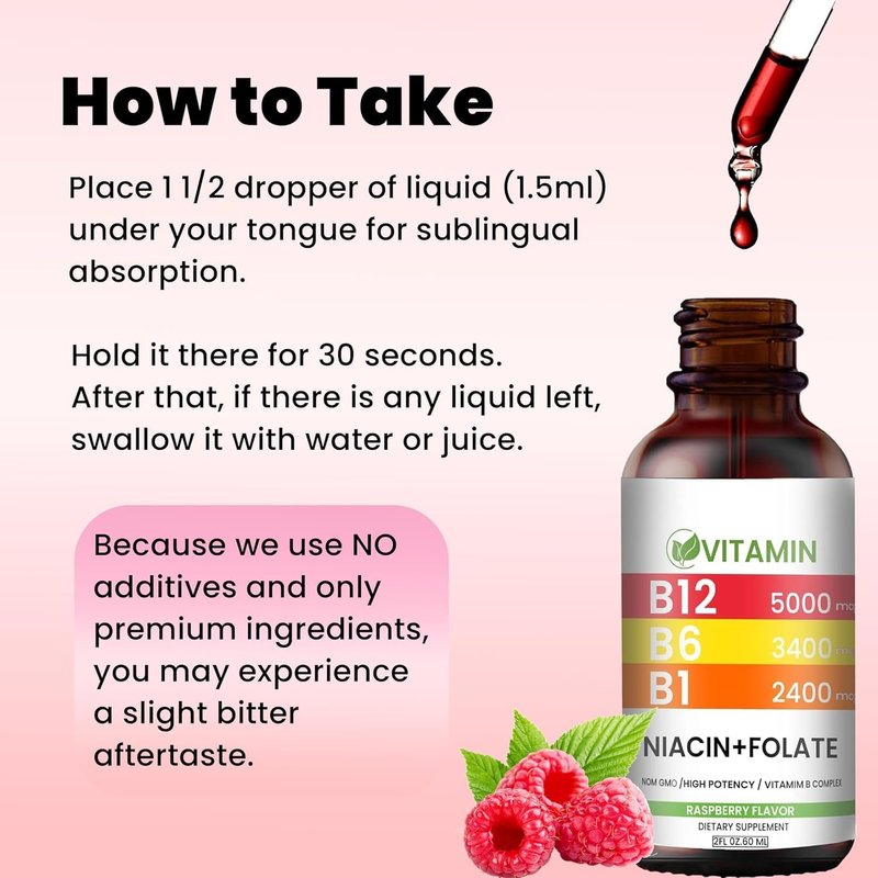 - B12 Drops Formulated for Maximum Potency - Our Liquid Vitamin B12 Drops contain Vit B12 5000mcg, B6, B1, Niacin, and Folic Acid, supporting overall body functions with 100% or more Daily Value.