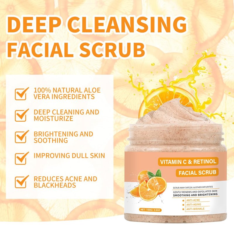 - VITAMIN C FACIAL SCRUB : Our facial scrub is specially formulated to brighten your complexion, helping to reduce the appearance of dark spots and uneven skin tone.Enriched with Vitamin C, leaving your skin refreshed and revitalized.