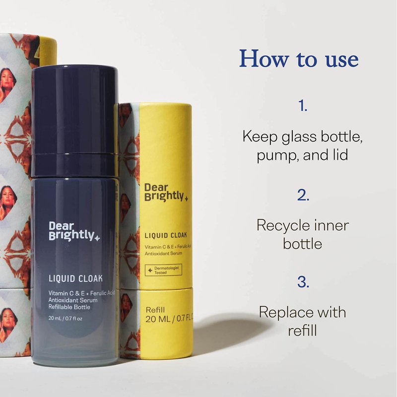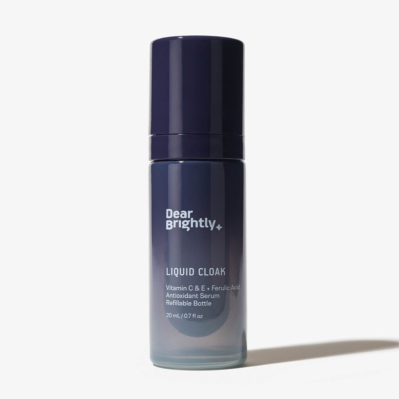 Vitamin C Serum with Ferulic Acid and Vitamin E for Glowing Radiant Skin by Dear Brightly, Liquid Cloak Facial Serum for Sensitive Skin, Refillable Glass Bottle, 0.7 fl oz