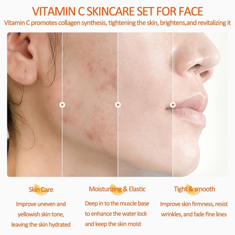 - 🍊【Vitamin C Skin Care Sets & Kits】- Elevate your skincare routine with this comprehensive set of moisturizing essentials: facial cleanser, toner, face serum, face cream, and eye cream. The vitamin C face care kit effectively revitalizes dull and dry skin, reducing wrinkles, spots, and acne marks. It also tightens the skin, minimizes pores, and maintains long-lasting moisture, leaving your skin radiant and supple.