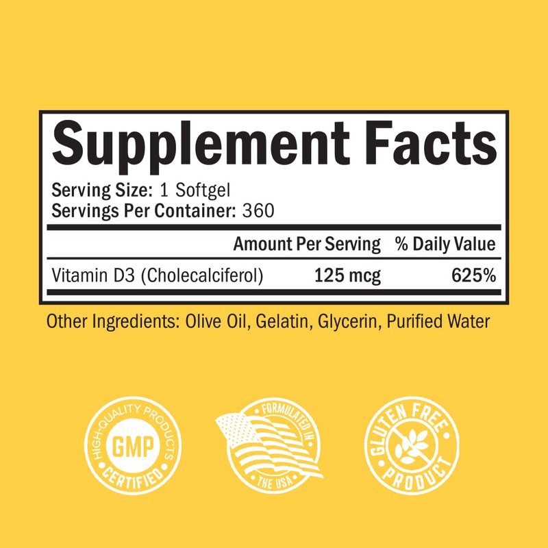 Vitamin D3 5000 IU (125 mcg) Natural Immune Support Supplement, Bone Strength, Healthy Muscle Function, with Olive Oil for Highest Absorption, Gluten Free & Non-GMO, 1 Year Supply, 360 Softgels