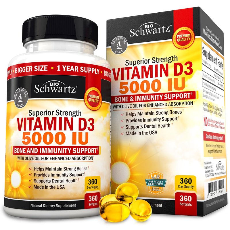 - Enhanced absorption & bioavailability: BioSchwartz superior strength vitamin D3 5000 IU features organic olive oil to help enhance absorption and maximum efficacy to deliver essential whole body benefits including immune, heart and bone health support