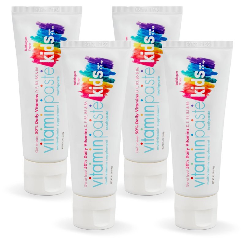 Vitaminpaste Kids Toothpaste with Daily Multivitamins B3, B5, B6, D, E, Xylitol, Calcium, Fluoride Free, Fresh Breath, Fights Tarter, Anti-Cavity, Safe to Swallow, 4.1oz, Bubble Gum Flavor, 4-Pack