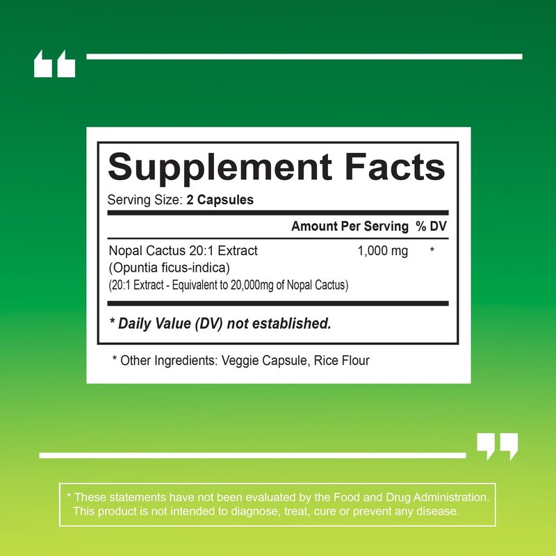Nopal Cactus(Prickly Pear Cactus) 20:1 Extract Capsules: 120 Veggie Capsules, Two capsules(1000mg) per Serving, 60 Day Supply.