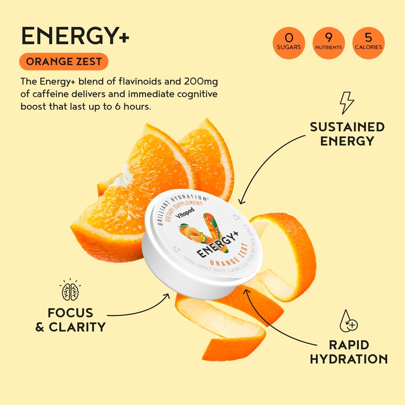 Vitapod Energy+ Orange Zest - Healthy Caffeine Energy Drink Mix - 30 Pods - Electrolytes, Antioxidants, Vitamin D, A, E, C - Water Enhancer