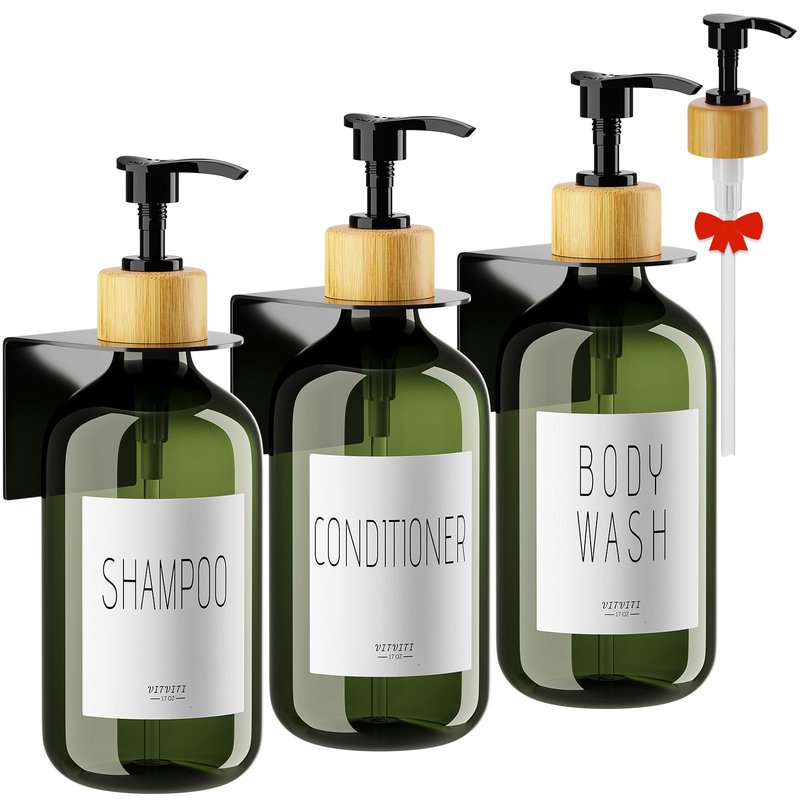 VITVITI Shampoo and Conditioner Dispenser, Body Wash Shower Soap Dispenser Wall Mounted 3 Chamber, Drill Free 17oz Plastic Shower Bottles for Bathroom, Dark Green 3 Sets