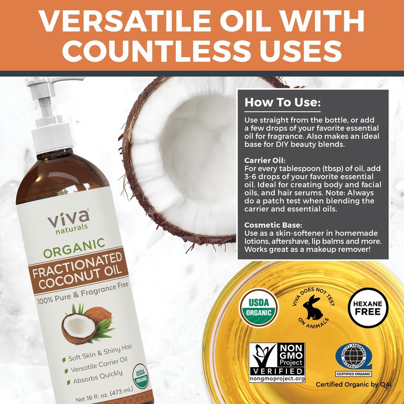 - ORGANIC FRACTIONATED COCONUT OIL - Similar to Virgin Coconut Oil, our Fractionated Coconut Oil is made from fresh, organic coconuts - with no added scent, it is 100% pure and hexane-free, USDA organic certified, non-GMO and not tested on animals.