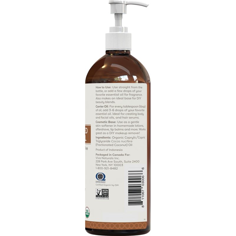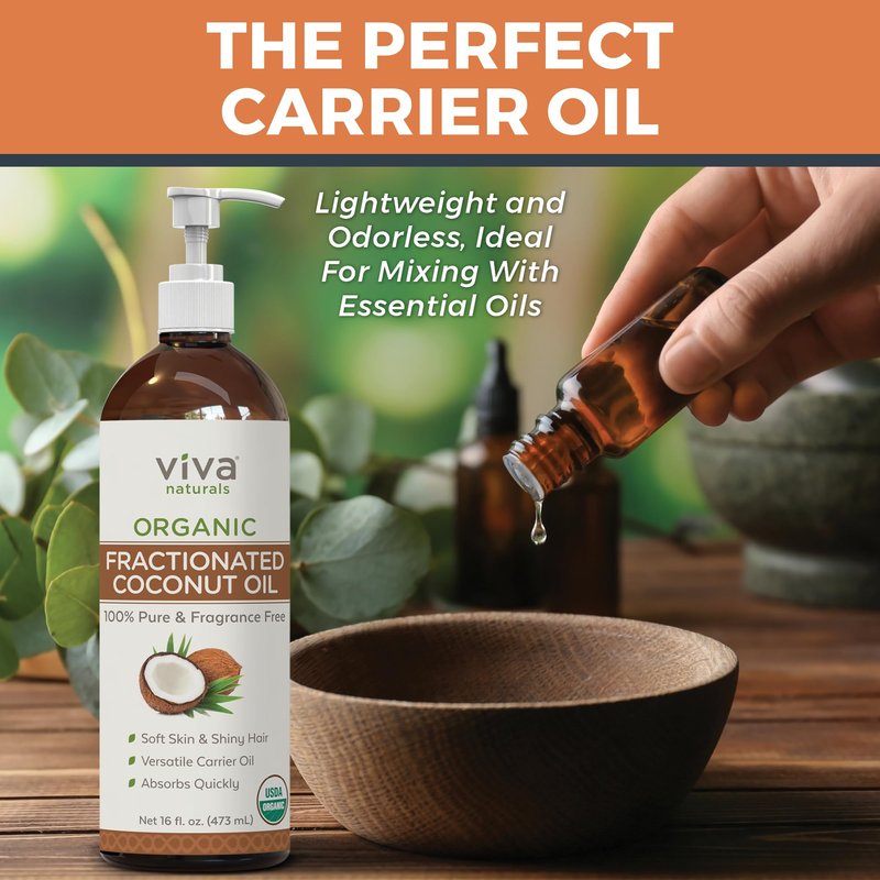 Viva Naturals Organic Fractionated Coconut Oil - Skin & Hair Moisturizer, Relaxing Massage and Body Oil, Carrier Oil for Essential Oils Mixing, Pure Non-Greasy Coconut Oil for Skin and Hair, 16 fl oz
