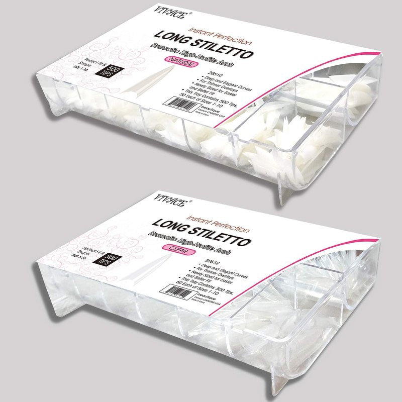 - Various Sizes: Vivace Natural/Clear stiletto nails come in 10 different sizes with 50 acrylic nails each in a segmented plastic case, so you can use and store them with ease. Various size options will easily fit every size and shape of finger nails.