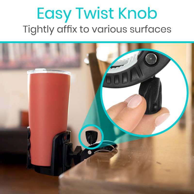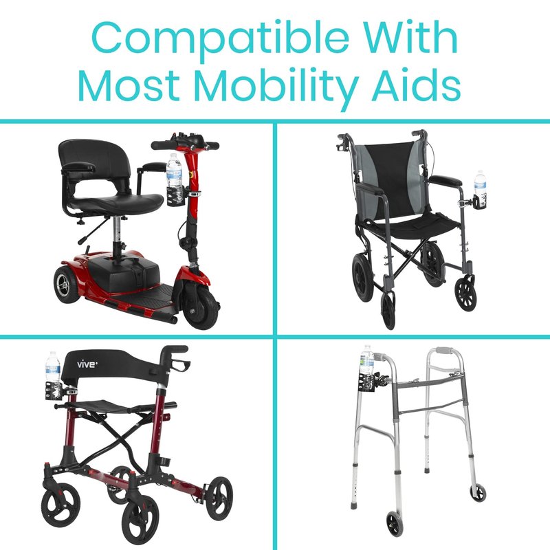 - VERSATILE AND UNIVERSAL FIT: Featuring a strong clamp mechanism and a swivel base, our durable Vive drink holder accessory easily attaches to any vertical, horizontal or diagonal bar on most mobility aids such as walkers, scooters, rollators, wheelchairs and canes.