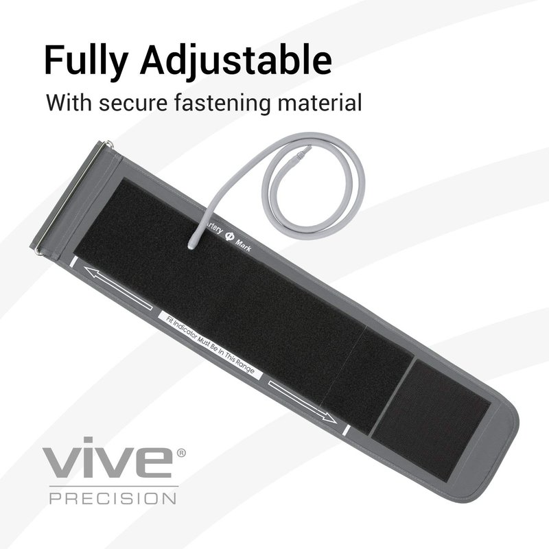 Blood Pressure Monitor Replacement Arm Cuff Easily replace worn arm cuffs with the Vive Precision blood pressure arm cuff. Featuring a straight connector, the upper arm cuff is compatible with the Vive Precision blood pressure monitors and similar models, including the Omron 10 Series monitors. The latex-free arm cuff is constructed with a durable nylon material and is easy to self-adjust, fitting a wide range of arm circumferences. Simple to Install: Easily replace worn or damaged blood pressure monitor cuffs with the Vive Precision replacement arm cuff. The replacement upper arm cuff has a straight connector for easily connecting to the existing monitor. Compatible Design: Capped with a standard straight connector, the replacement arm cuff is compatible with Vive Precision blood pressure monitor, Omron 10 Series and similar models. Adjustable Cuff Size: Featuring an integrated D-ring, the replacement blood pressure monitor cuff is easy to self-adjust for greater accuracy. Sturdy Nylon Construction: Durably constructed with a strong nylon material and latex-free hose for long term usability. What’s Included: Vive Precision Replacement Arm Cuff