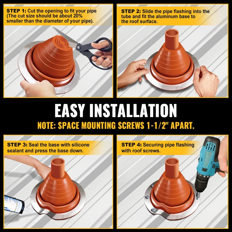 - 【#3 PIPE FLASHING BOOT】#3 Metal roofing pipe flashing is suitable for 1/4"-5" OD pipe. The rubber pipe boot can be cut to size easily. Please make sure to buy the right size pipe boot and don't over tighten screws.