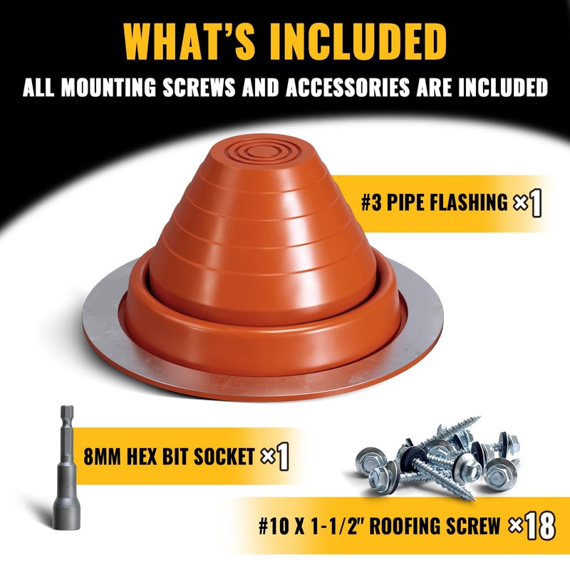 - 【WHAT'S INCLUDED】Package contains #3 metal roofing pipe flashing 1 PCS, #10 x 1-1/2" roofing screws 18 PCS, 8mm hex bit socket 1 PCS. Meet the needs of your installation.