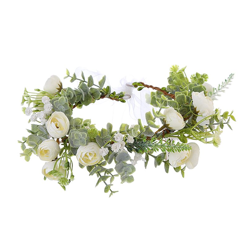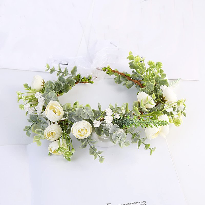 Vivivalue Women Flower Crown Flower Garland Headband Hair Wreath Floral Headpiece Halo Boho with Ribbon Wedding Party Photos White