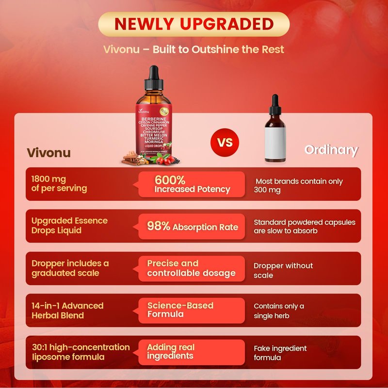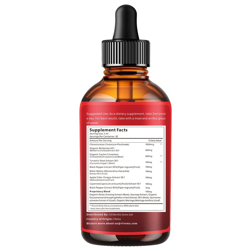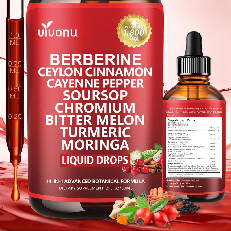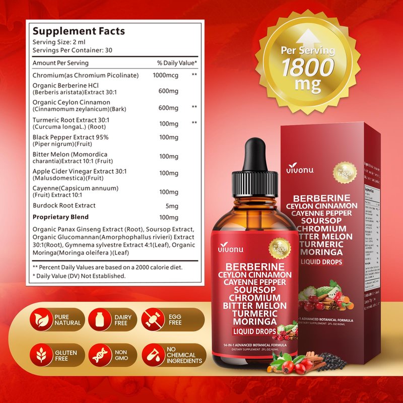 VivoNu Advanced Berberine & Cinnamon Drops – 14-in-1 Herbal Extracts with Chromium, Gymnema, Turmeric, Apple Cider Vinegar, Cayenne – 1800mg Potent Liquid Formula
