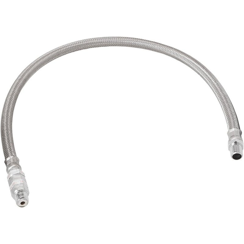 This chrome look stainless steel braided leader hose is a direct replacement for the one present on VXC8101 and VXC8301 air compressors, but can also be used on any compressor with a ¼" NPT female port. The hose measures 24" long and includes a swivel ¼" NPT in-line check valve to allow the air to flow in only one direction. Inside the braided metal protection is a strong heavy duty rubber hose. The perfect replacement solution for worn out hoses. Stainless Steel Air Compressor Braided Leader Hose (Chrome Color) ¼" NPT Male to ¼" NPT Male Length: 24" Check Valve Included Heavy Duty Rubber Hose Inside Abrasion And Corrosion Resistant Recommended Torque: 16 to 18 lbs Use Thread Sealant For Proper Installation