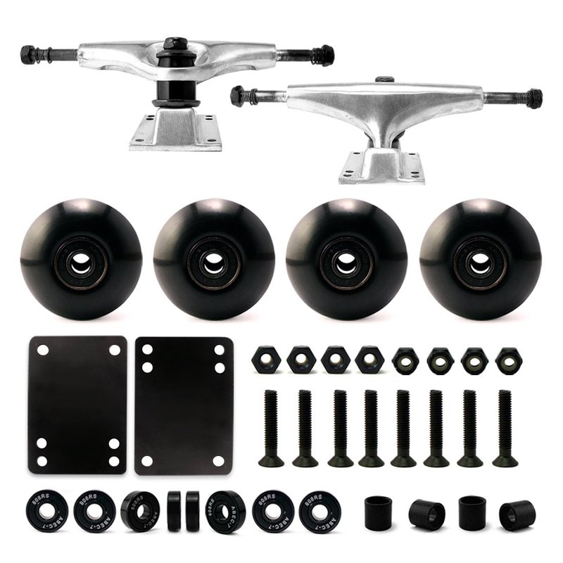 - SKATEBOARD PARTS SET: It includes skateboard trucks 5.0, skateboard wheels, skateboard bearings Abec 7, skateboard screws 1", skateboard riser pads 2mm, skateboard spacer