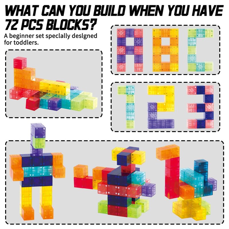 - 【Montessori Toys for Toddler】 Montessori children's toys over the age of 3 are designed with translucent surfaces, which can glow in the dark, so that children can have more fun. 72 multi-color box sets, so that children can achieve more masterpieces when building.